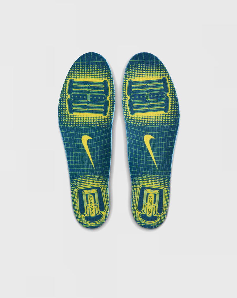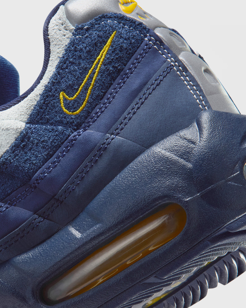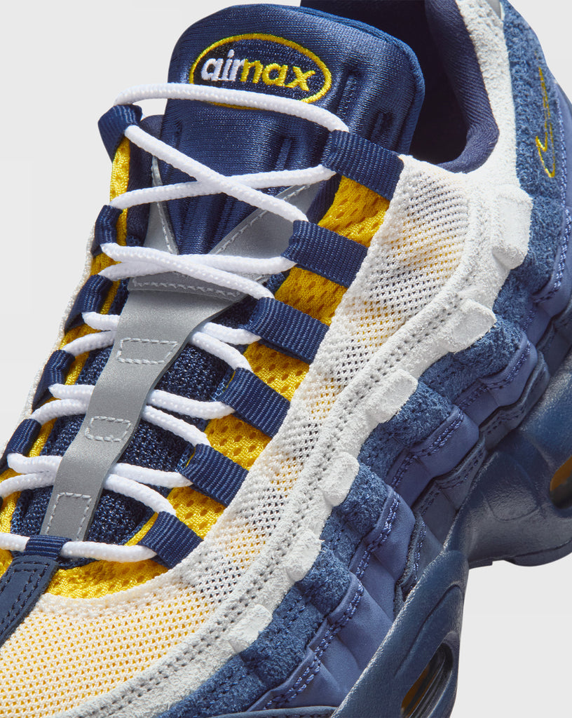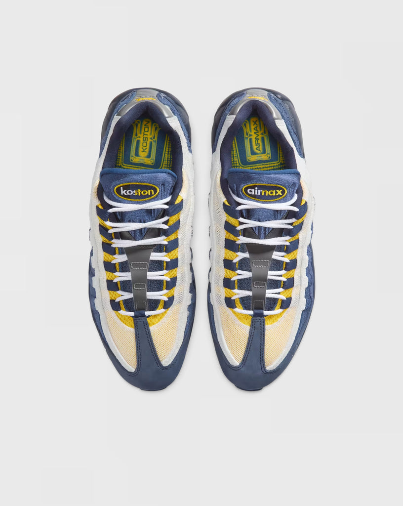 Adding Koston name-skate details to the AM95 tongue logo and sockliner, Eric requested a unique toe-tip Nike detail in Thai script to honour his heritage and serve as a callback to his early SB designs. Using the distinct skeletal-inspired lines of the OG, the Koston Air Max 95 features specific enhancements for skateboarding, including a leather and suede upper, folded edge, double-stitch reinforcement in key wear areas for durability, and reduced foam and updated lugs with herringbone tread for board feel and traction while maintaining the aesthetics and functionality of the original AM95 Max Air unit.