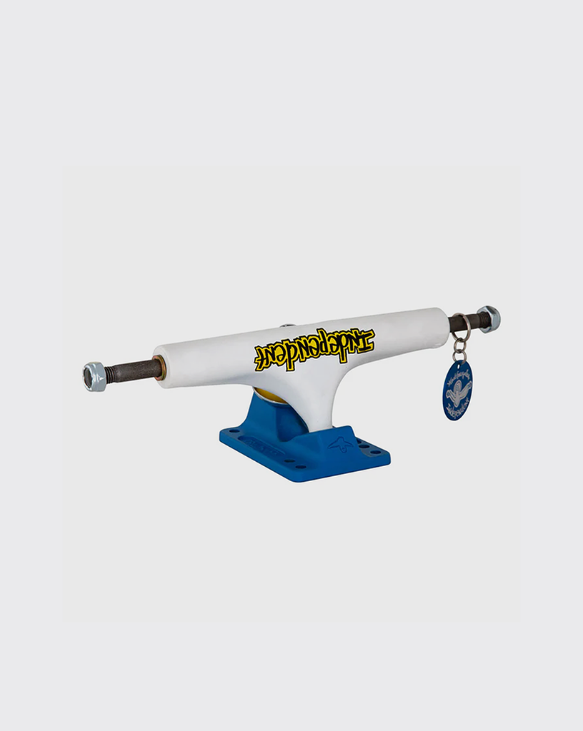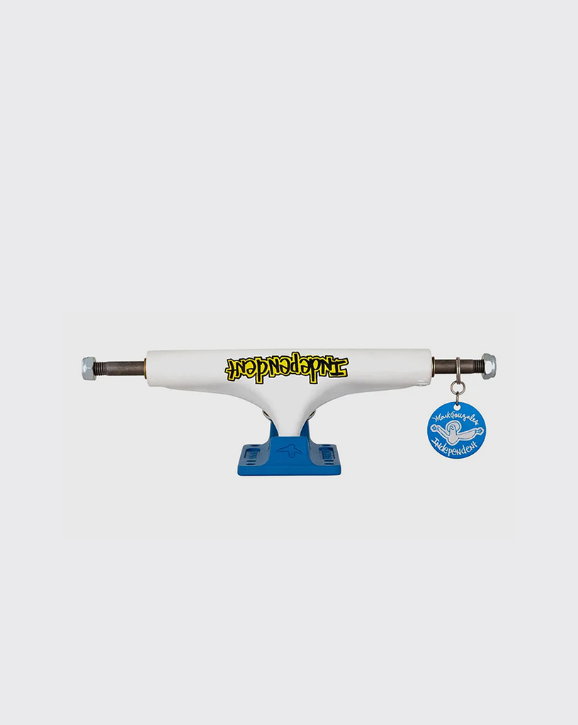 Independent Truck Company Mark Gonzales Pro Stage 4 trucks featuring flat-white printed hanger, blue fine texture baseplate with Shmoo stamp, logo printed yellow cushions, silver hardware, and laser etched aluminum keychain hangtag.